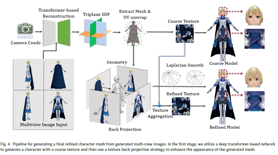 그림 4는 생성된 멀티뷰 이미지로부터 최종 세밀한 캐릭터 메쉬를 생성하는 파이프라인을 보여줍니다. 첫 번째 단계에서는 딥 트랜스포머 기반 네트워크를 사용하여 조잡한 텍스처를 가진 캐릭터를 생성한 후, 텍스처 역투영 전략을 사용하여 생성된 메쉬의 외형을 향상시킵니다.