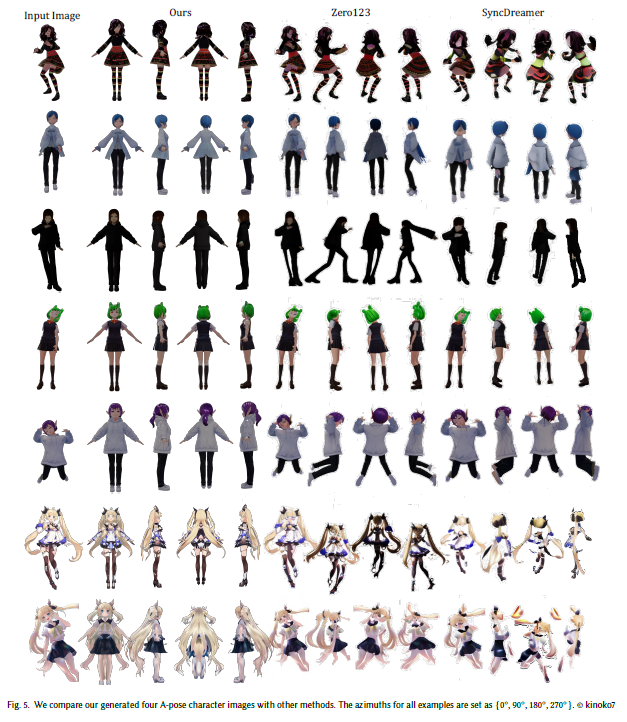 그림 5: 다른 방법들과 우리 방법으로 생성된 네 개의 A-포즈 캐릭터 이미지를 비교합니다. 모든 예제의 방위각은 {0°, 90°, 180°, 270°}로 설정되어 있습니다.