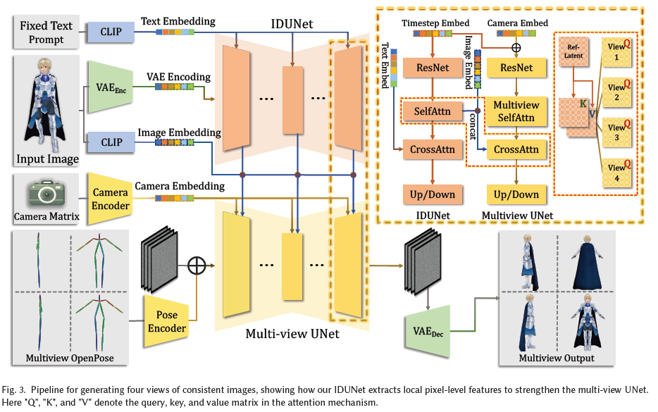 그림 3은 일관된 이미지의 네 가지 뷰를 생성하는 파이프라인을 보여주며, IDUNet이 로컬 픽셀 수준의 기능을 추출하여 멀티뷰 UNet을 강화하는 방법을 설명합니다. 여기서 "Q", "K" 및 "V"는 주의 메커니즘의 쿼리, 키 및 값 행렬을 나타냅니다.