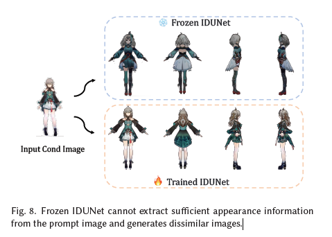 IDUNet은 멀티뷰 UNet에 픽셀 수준의 특징을 제공하기 위해 사용되며, 입력 조건 이미지에 노이즈를 추가하면 3D 캐릭터의 텍스처 세부 사항이 크게 감소합니다. 반면, 전통적인 디노이징 UNet은 시간 단계에 따라 노이즈를 예측하기 위해 노이즈가 있는 이미지에 적용됩니다. 따라서 우리는 노이즈가 없는 입력 이미지를 인코딩하기 위해 직접적으로 VAE를 채택합니다.