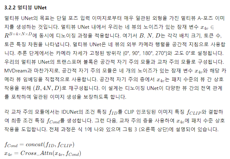 조건 이미지의 특징을 더 잘 통합하기 위해, 우리는 IDUNet을 제안하여 생성 과정에서 픽셀 수준의 지침을 도입합니다. ControlNet에서 영감을 받아, IDUNet의 구조는 멀티뷰 UNet과 동일합니다. IDUNet은 "best quality"라는 고정된 텍스트 프롬프트를 사용하여 생성 과정에서 일반적인 지침을 제공합니다. ControlNet과 달리, 디노이징된 이미지와 조건 이미지의 모든 패치 간의 로컬 패치 수준 상호작용을 보장하기 위해, 단순히 두 이미지를 함께 추가하는 대신, 잠재 토큰과 조건 이미지 토큰 간의 교차 주의를 활용합니다.
