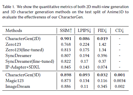 표 1. 우리는 Anime3D의 테스트 분할에서 2D 멀티뷰 생성 및 3D 캐릭터 생성 방법의 정량적 메트릭을 보여주어 CharacterGen의 효과를 평가합니다.