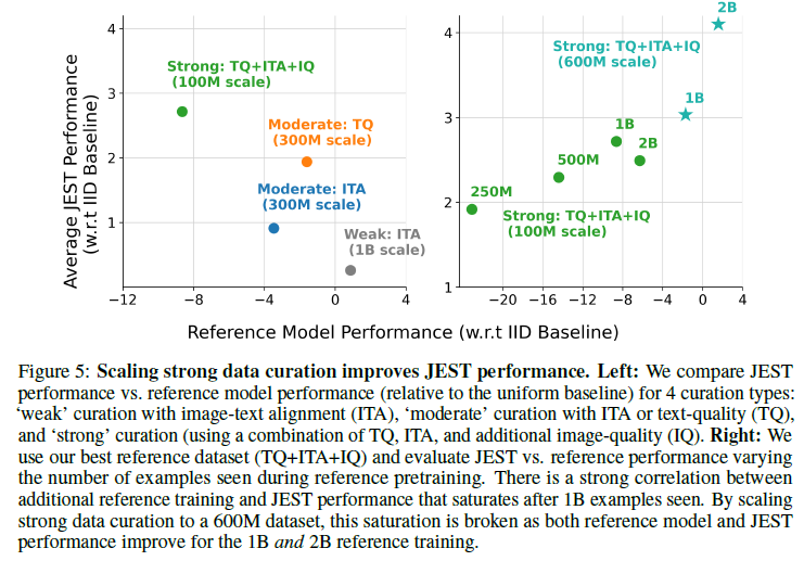 - 왼쪽: 4가지 큐레이션 유형에 대해 JEST 성능과 참조 모델 성능을 비교합니다: 이미지-텍스트 정렬(ITA)을 사용한 ‘약한’ 큐레이션, ITA 또는 텍스트 품질(TQ)을 사용한 ‘중간’ 큐레이션, 그리고 TQ, ITA 및 추가 이미지 품질(IQ)을 사용하는 ‘강한’ 큐레이션.