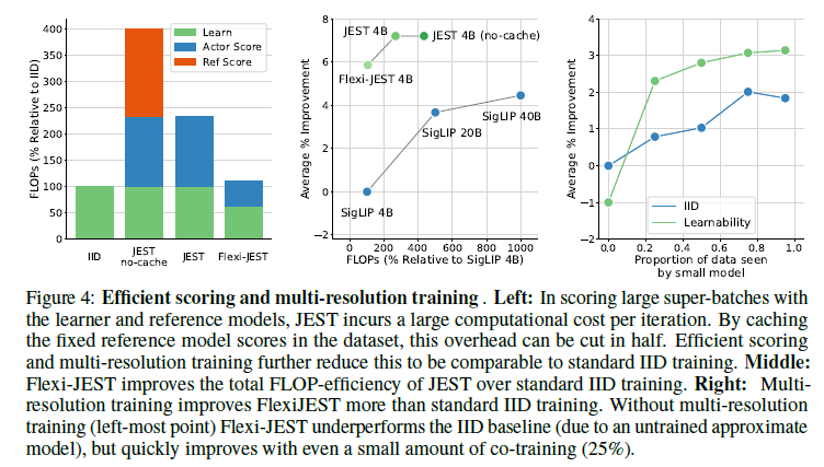 - 왼쪽: 학습자와 참조 모델로 큰 슈퍼배치를 점수화할 때, JEST는 반복당 큰 계산 비용을 초래합니다. 데이터셋에 고정된 참조 모델 점수를 캐싱하면 이 오버헤드는 절반으로 줄일 수 있습니다. 효율적인 점수화와 다중 해상도 훈련은 이를 표준 IID 훈련과 비교할 만한 수준으로 더욱 줄입니다.