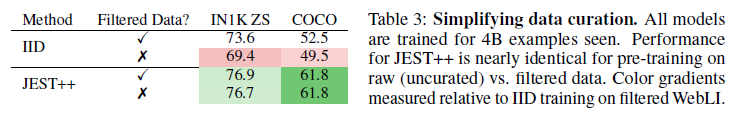 우리의 사전 훈련 실험에 사용된 WebLI 데이터셋[10]은 이미 높은 이미지-텍스트 정렬을 위해 필터링되었습니다. 표 3에서 알 수 있듯이, 이 오프라인 큐레이션은 강력한 IID 훈련 성능에 중요합니다. 그러나 JEST++의 경우, 이 사전 필터링은 중복되며, 필터링되지 않은 WebLI에서 훈련할 때 성능이 저하되지 않아 기초 데이터셋에 대한 필요성을 줄여줍니다.