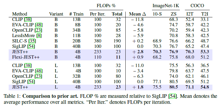 표 1: 선행 기술과의 비교. FLOP %는 SigLIP [54]을 기준으로 측정되었습니다. 평균은 모든 메트릭에 대한 평균 성능을 나타냅니다. “Per Iter."는 반복당 FLOP을 나타냅니다.