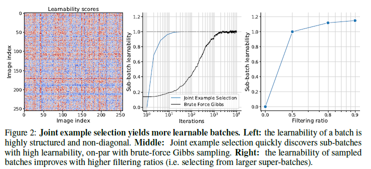 - 오른쪽: 샘플링된 배치의 학습 가능성은 더 높은 필터링 비율(즉, 더 큰 슈퍼배치에서 선택)로 향상됩니다.