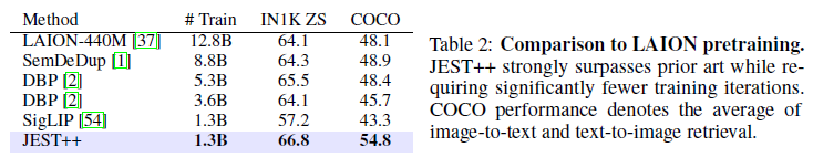 마지막으로, 우리는 JEST++를 공개된 LAION-2B 데이터셋[44]에 대해 사전 훈련에 적용했습니다. 우리는 안전하지 않은 이미지-텍스트 쌍을 제거하는 표준 절차를 따랐지만, 데이터셋을 사전 필터링하지 않았습니다. JEST++는 이전 오프라인 데이터 큐레이션 방법을 크게 능가하며, 이전 최첨단보다 4배 적은 훈련 예제를 사용했습니다(표 2). 이 훈련 예산으로, SigLIP 사전 훈련은 모든 방법에 비해 성능이 크게 떨어져, JEST의 이점을 더욱 강조합니다.