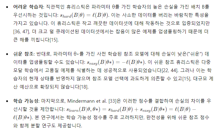 - 학습자의 손실과 참조 모델의 손실 차이를 이용하여 배치를 선택합니다. 학습자에게는 어렵지만 참조 모델에게는 쉬운 이미지를 우선시합니다.