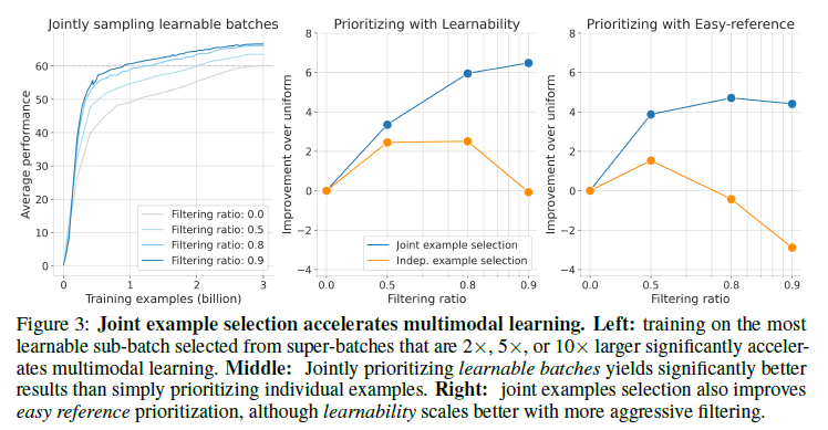 - 왼쪽: 2배, 5배, 또는 10배 큰 슈퍼배치에서 선택된 가장 학습 가능한 서브배치로 훈련하면 다중모달 학습이 크게 가속화됩니다.