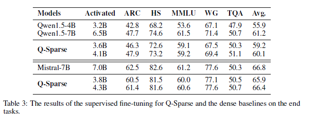표 3은 최종 작업에서 Q-Sparse와 밀집 기준 모델의 지도 학습 미세 조정 결과를 보여줍니다.