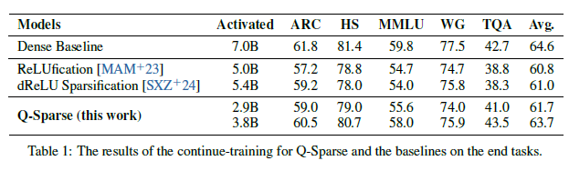 표 1은 최종 작업에서 Q-Sparse와 기준 모델의 계속 훈련 결과를 보여줍니다.