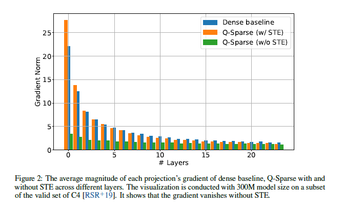 그림 2는 C4[RSR+19]의 유효 셋의 하위 집합에 대해 300M 모델 크기로 밀집 기준, STE가 적용된 Q-Sparse, STE가 적용되지 않은 Q-Sparse의 각 레이어에 걸친 투영 기울기의 평균 크기를 시각화한 것입니다. STE가 없을 경우 기울기가 소실되는 것을 보여줍니다.