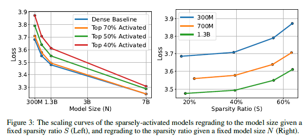 - 약 40%의 희소성 비율을 가진 희소하게 활성화된 모델의 성능은 동일한 모델 크기와 훈련 토큰을 가진 밀집 기준 모델의 성능과 일치할 수 있습니다.