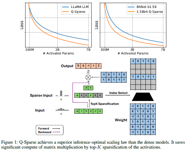 Q-Sparse는 밀집 모델보다 우수한 추론 최적화 스케일링 법칙을 달성합니다. 활성화의 top-K 희소화를 통해 행렬 곱셈의 연산을 상당히 절약합니다.