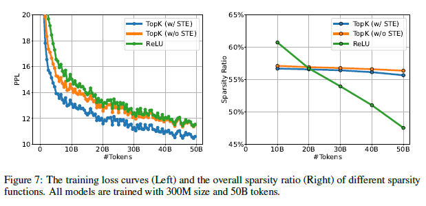 top-K 희소성 함수의 효과를 평가하기 위해 우리는 top-K 희소성 함수와 ReLU 희소성 함수를 가진 희소하게 활성화된 모델의 성능을 비교합니다. 또한, STE의 효과를 평가하기 위해 STE가 있는 모델과 없는 모델을 비교합니다. 그림 7은 결과를 보여줍니다. 이는 STE를 제거하거나 ReLU 함수로 대체하면 성능이 크게 저하됨을 보여줍니다. 또한, ReLU 함수를 사용하는 모델의 희소성 비율은 훈련이 진행됨에 따라 감소하는 반면, top-K 희소성 함수를 사용하는 모델의 희소성 비율은 변하지 않습니다. 그림 8에서 보듯이, 우리는 다양한 구성 요소에서의 희소성 비율의 기여도를 분석하여, 감소하는 희소성이 주로 QKV 프로젝션, 게이팅 프로젝션 및 피드포워드 레이어의 업 프로젝션에서 비롯됨을 발견합니다. 이는 top-K 함수가 ReLU 함수보다 우수함을 증명합니다.
