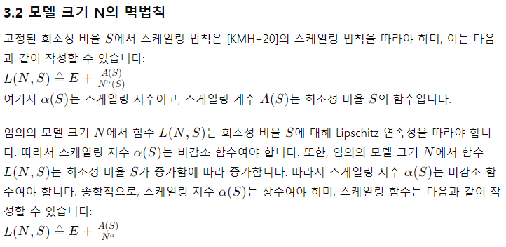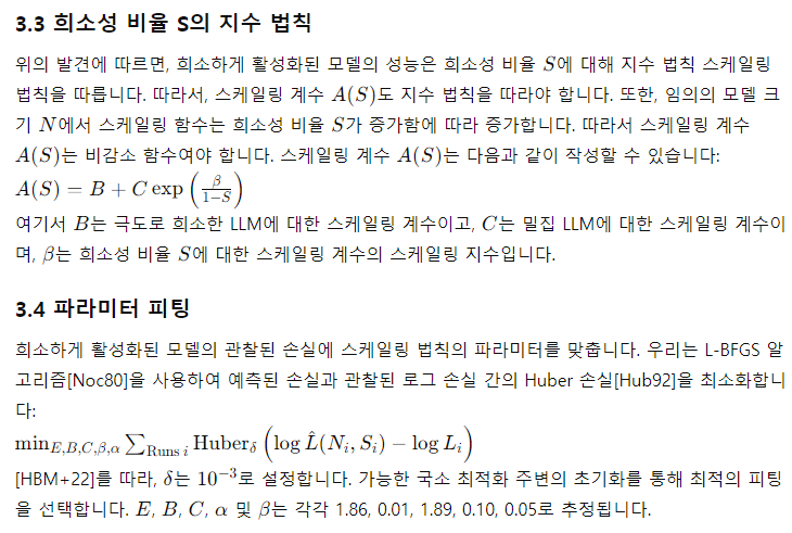 - 고정된 파라미터 N에서, 희소하게 활성화된 모델의 성능은 희소성 비율 S에 대해 지수 법칙 스케일링 법칙을 따릅니다.