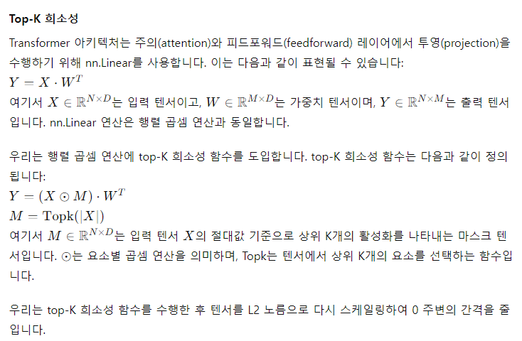 피드포워드 레이어에 squared ReLU 함수가 없는 사전 훈련된 모델의 경우, 피드포워드 레이어에서 활성화 함수(예: SiLU) 후에 top-K 희소성 함수를 적용합니다. 이렇게 하면 모델 아키텍처를 변경하지 않고도 활성화의 희소성을 향상시킬 수 있습니다.