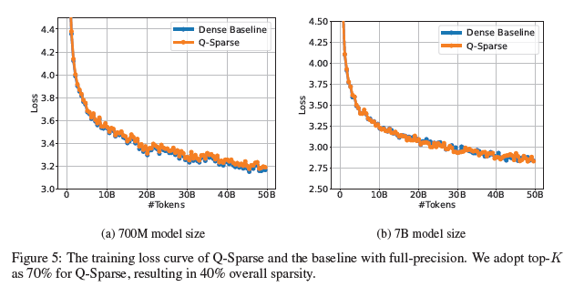 그림 5는 풀 프리시전으로 Q-Sparse와 기준 모델의 훈련 손실 곡선을 보여줍니다. Q-Sparse의 경우 top-K를 70%로 채택하여 전체 희소성을 40%로 만듭니다.