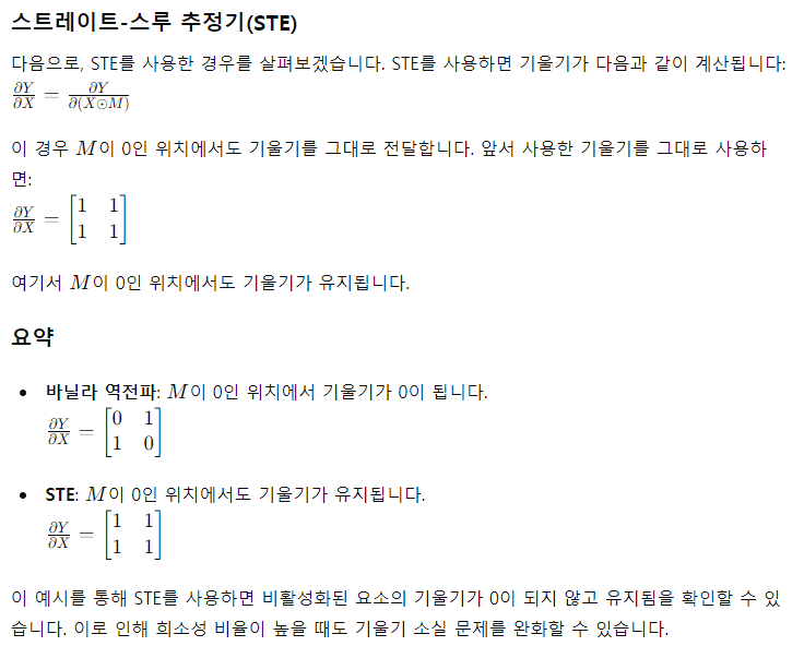 STE는 희소성 함수나 양자화 함수와 같은 비분리 가능 함수에서 기울기를 계산하기 위해 사용되는 방법입니다. STE는 역전파 시 활성화되지 않은 요소들의 기울기가 0이 되는 문제를 해결하여 기울기 소실 문제를 완화합니다.