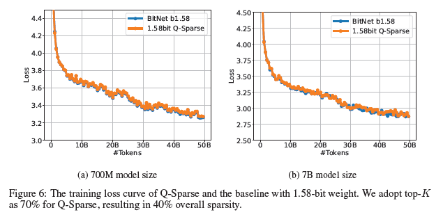 그림 6는 1.58비트 가중치로 Q-Sparse와 기준 모델의 훈련 손실 곡선을 보여줍니다. Q-Sparse의 경우 top-K를 70%로 채택하여 전체 희소성을 40%로 만듭니다.