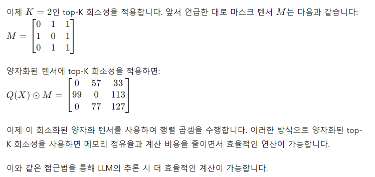 희소성은 LLMs의 효율성에 두 가지 요소를 기여합니다. 첫째, 희소성은 0 요소가 계산되지 않으므로 행렬 곱셈의 계산량을 줄일 수 있습니다. 둘째, 희소성은 메모리와 계산 유닛 간에 매개변수를 전송하는 입출력(I/O) 양을 줄일 수 있습니다. I/O 전송은 LLMs의 추론 단계에서 주요 병목 현상으로 작용합니다. LLMs에서 희소성을 적용하는 일반적인 접근법은 가중치 희소성을 사용하는 것으로, 이는 모델 가중치를 가지치기하여 계산을 절약합니다. 그러나 비구조적 가중치 희소성은 GPU 장치에서 병렬 처리가 어려운 반면, 구조적 가중치 희소성은 모델의 정확성에 큰 영향을 미칩니다.