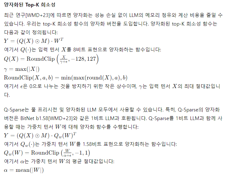 - Q-Sparse는 풀-프리시전 LLM과 1비트 LLM(BitNet b1.58 [WMD+23] 등) 모두에 적용될 수 있습니다. 특히, BitNet b1.58과 Q-Sparse의 시너지(이 둘은 MoE와 함께 사용할 수 있음)는 미래의 LLM의 효율성, 비용, 에너지 소비를 혁신하는 데 중요한 기반과 명확한 길을 제공합니다.