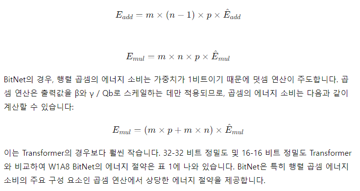 우리는 산술 연산 에너지와 메모리 사용량 측면에서 BitNet의 계산 효율성을 추정합니다. 주로 대형 언어 모델의 비용에 가장 크게 기여하는 행렬 곱셈의 계산에 중점을 둡니다.
