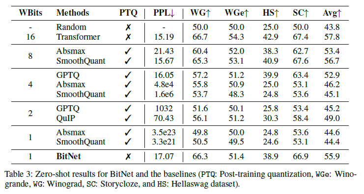 표 3: BitNet과 기준 모델의 제로샷 결과 (PTQ: 사후 훈련 양자화, WGe: Winogrande, WG: Winograd, SC: Storycloze, HS: Hellaswag 데이터셋).