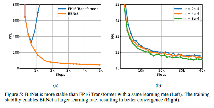 Figure 5: 동일한 학습률에서 FP16 Transformer보다 더 안정적인 BitNet(왼쪽). 훈련 안정성 덕분에 BitNet은 더 큰 학습률을 가능하게 하여 더 나은 수렴을 이끌어냄(오른쪽).