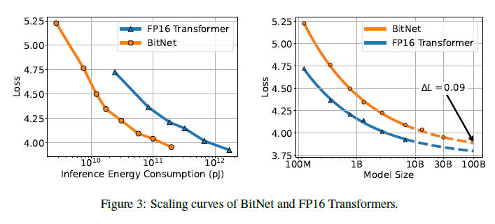그림 3: BitNet과 FP16 Transformer의 스케일링 곡선.
