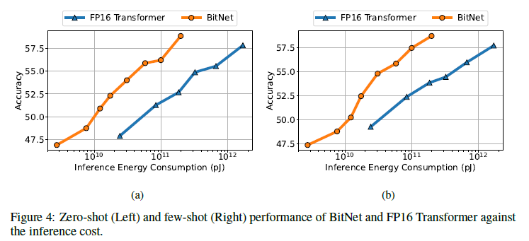 Figure 4: BitNet과 FP16 Transformer의 추론 비용 대비 0-shot(왼쪽) 및 few-shot(오른쪽) 성능.
