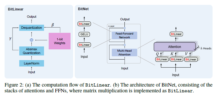 (a) BitLinear의 계산 흐름. (b) BitNet의 아키텍처로, BitLinear로 구현된 행렬 곱셈이 포함된 주의(attentions)와 FFNs의 스택으로 구성되어 있습니다.