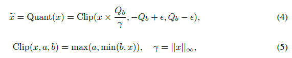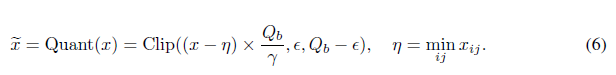 여기서 ϵ는 클리핑 수행 시 오버플로우를 방지하는 작은 실수입니다. 비선형 함수(예: ReLU) 이전의 활성화에 대해서는, 모든 값을 비음수로 만들기 위해 입력의 최소값을 빼서 [0, Qb] 범위로 스케일링합니다: