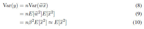 우리는 W와 x의 요소가 상호 독립적이며 동일한 분포를 공유하고, W와 x가 서로 독립적이라고 가정합니다. 그러면 출력 y의 분산은 다음과 같이 추정됩니다: