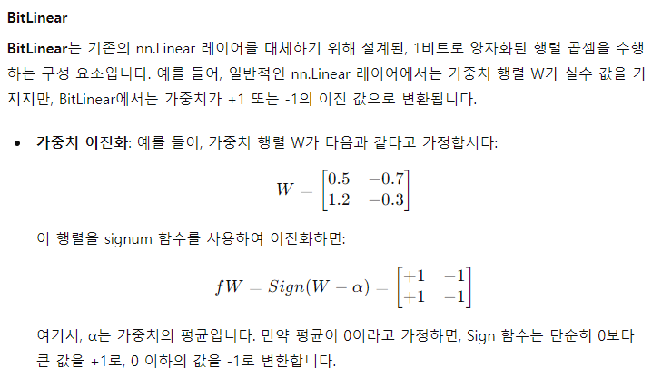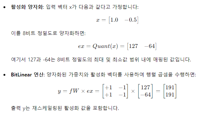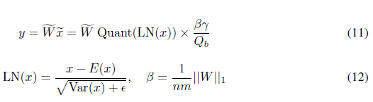 정밀한 계산의 경우, 출력 Var(y)의 분산은 표준 초기화 방법(예: Kaiming 초기화 또는 Xavier 초기화)으로 1의 규모로 설정되며, 이는 훈련 안정성에 큰 이점을 제공합니다. 양자화 후 분산을 유지하기 위해, 활성화 양자화 전에 LayerNorm[BKH16] 함수를 도입합니다. 이 방식으로, 출력 y의 분산은 Var(y) ≈ E[LN(x)^2] = 1로 추정되며, 이는 정밀한 대응물 Var(y)와 동일한 규모를 가집니다. Transformer의 문맥에서, 이는 SubLN[WMH+22]과 동일한 구현을 가집니다. SubLN과 위의 양자화 방법을 사용하여, BitLinear는 다음과 같이 공식화됩니다: