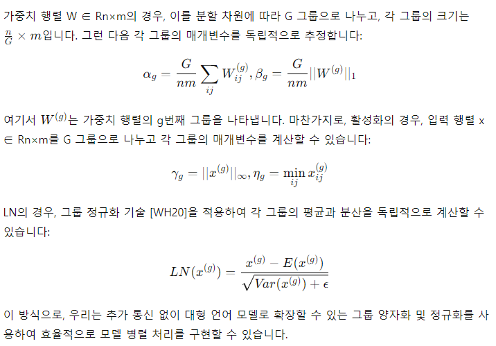 이를 해결하기 위해, 우리는 모델 병렬 처리를 보다 효율적으로 만드는 간단한 접근 방식을 제안합니다. 가중치와 활성화를 그룹으로 나눈 후 각 그룹의 매개변수를 독립적으로 추정합니다. 이렇게 하면 매개변수를 추가 통신 없이 로컬에서 계산할 수 있습니다. 이 접근 방식은 그룹 양자화(Group Quantization)라고 하며, 다음과 같이 공식화됩니다: