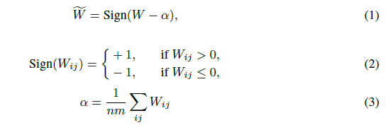 우리는 먼저 가중치를 signum 함수를 사용하여 +1 또는 -1로 이진화합니다. [LOP+22]를 따라, 이진화 전에 가중치를 중앙 집중화하여 제한된 수치 범위 내에서 용량을 늘립니다. 이진화 후 스케일링 계수 β를 사용하여 실수형 가중치와 이진화된 가중치 사이의 l2 오차를 줄입니다. 가중치 W ∈ R^(n×m)의 이진화는 다음과 같이 공식화할 수 있습니다: