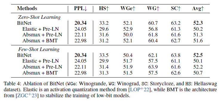 표 4: BitNet의 분할 실험 결과 (WGe: Winogrande, WG: Winograd, SC: Storycloze, HS: Hellaswag 데이터셋). Elastic은 [LOP+22]에서 온 활성화 양자화 방법이며, BMT는 [ZGC+23]에서 저비트 모델의 훈련 안정성을 위해 사용된 아키텍처입니다.