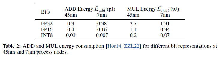표 2: 45nm 및 7nm 공정 노드에서 다양한 비트 표현에 대한 ADD 및 MUL 에너지 소비[Hor14, ZZL22].