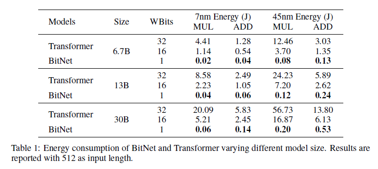표 1: BitNet과 Transformer의 에너지 소비 (모델 크기별)
