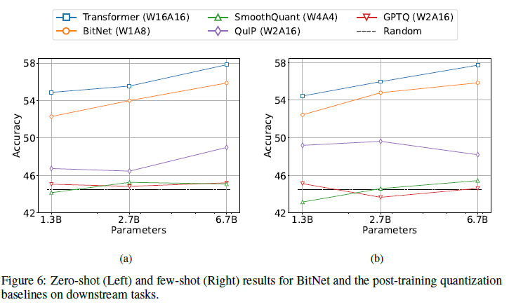 Figure 6: 다운스트림 작업에서 BitNet과 사후 훈련 양자화 기준 모델의 제로샷(왼쪽) 및 few-shot(오른쪽) 결과.
