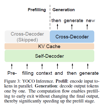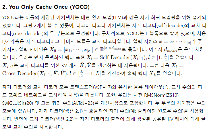 이 연구에서는 대형 언어 모델을 위한 디코더-디코더 아키텍처인 YOCO를 제안합니다. 이 아키텍처는 KV 쌍을 한 번만 캐시합니다. 구체적으로, 우리는 자기 디코더 위에 교차 디코더를 쌓습니다. 입력 시퀀스가 주어지면 자기 디코더는 효율적인 자기 주의를 활용하여 KV 캐시를 획득합니다. 그런 다음 교차 디코더 층은 교차 주의를 사용하여 공유된 KV 캐시를 재사용합니다. 디코더-디코더 아키텍처는 개념적으로 인코더-디코더와 유사하지만, 외부에서는 전체 모델이 디코더 전용 모델처럼 작동합니다. 따라서 언어 모델링과 같은 자기 회귀 생성 작업에 자연스럽게 적합합니다. 첫째, YOCO는 한 번만 캐시하기 때문에 KV 캐시의 GPU 메모리 소비가 크게 줄어듭니다. 둘째, 디코더-디코더 아키텍처의 계산 흐름은 자기 디코더에 진입하기 전에 조기 종료를 위한 사전 채우기를 가능하게 합니다. 이 속성은 사전 채우기 단계를 극적으로 가속화하여 긴 문맥 언어 모델의 사용자 경험을 개선합니다. 셋째, YOCO는 분산된 긴 시퀀스 학습을 위한 더 효율적인 시스템 설계를 가능하게 합니다. 추가로, 우리는 데이터 제어 게이팅 메커니즘으로 유지(retention)를 강화하는 게이티드 유지(self-decoder용)를 제안합니다.