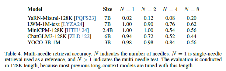 표 4는 다중 바늘 검색 정확도를 나타냅니다. N은 바늘의 수를 나타냅니다. N=1은 참조로 사용되는 단일 바늘 검색이며, N>1은 다중 바늘 테스트를 나타냅니다. 평가는 대부분의 이전 긴 문맥 모델이 이 길이로 조정되었기 때문에 128K 길이에서 수행됩니다.