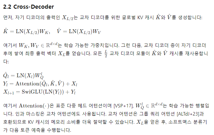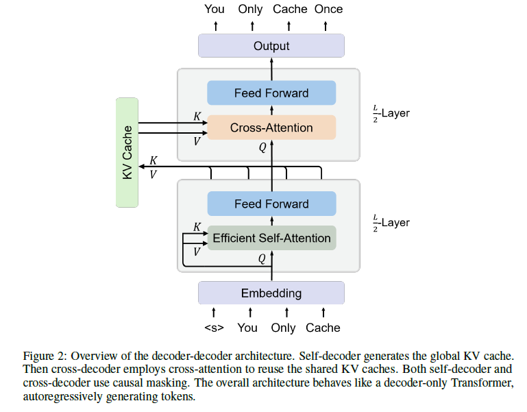 그림 2: 디코더-디코더 아키텍처의 개요. 자기 디코더는 글로벌 KV 캐시를 생성합니다. 그런 다음 교차 디코더는 교차 주의를 사용하여 공유된 KV 캐시를 재사용합니다. 자기 디코더와 교차 디코더 모두 인과 마스킹을 사용합니다. 전체 아키텍처는 자기 회귀적으로 토큰을 생성하는 디코더 전용 트랜스포머처럼 작동합니다.