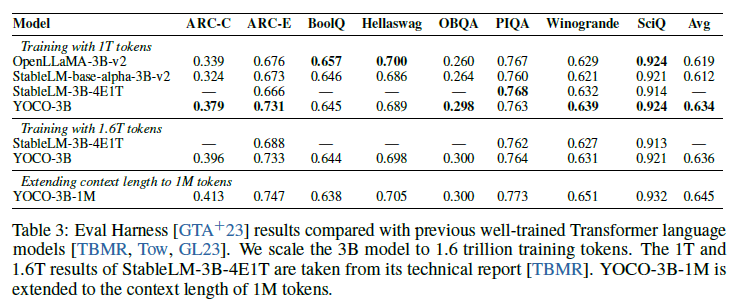 표 3은 이전의 잘 훈련된 트랜스포머 언어 모델 [TBMR, Tow, GL23]과 비교한 Eval Harness [GTA+23] 결과를 보여줍니다. 우리는 3B 모델을 1.6조(1.6T) 학습 토큰으로 확장했습니다. StableLM-3B-4E1T의 1T 및 1.6T 결과는 해당 기술 보고서 [TBMR]에서 가져왔습니다. YOCO-3B-1M은 문맥 길이를 100만(1M) 토큰으로 확장했습니다.