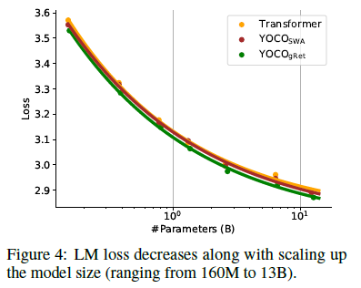 그림 4는 다양한 파라미터 수에 따른 검증 손실을 보고합니다. 우리는 [KMH+20]에서와 같이 확장 곡선을 맞춥니다. YOCO는 160M에서 13B까지 Llama 최적화 트랜스포머 아키텍처와 비교하여 유사한 성능을 얻습니다. 이 발견은 YOCO가 모델 크기 측면에서 효과적으로 확장됨을 보여줍니다. 더욱이, YOCOgRet는 트랜스포머와 YOCOSWA보다 뛰어난 성능을 보입니다. 이러한 성과는 주의(attention)와 유지(retention)의 하이브리드 아키텍처에서 비롯되며, 이들의 유도 편향(inductive biases)은 서로 상호 보완적인 경향이 있습니다. 주의 모듈과 유지 모듈을 교차하여 배치(1:3)했을 때 유사한 이득을 관찰했습니다. 최근 하이브리드 아키텍처 [LLB+24]도 유사한 발견을 확인합니다.