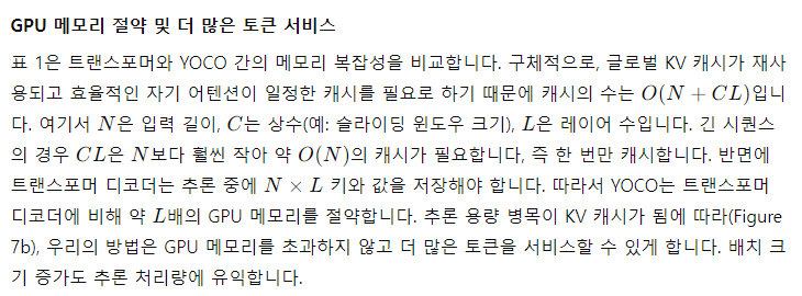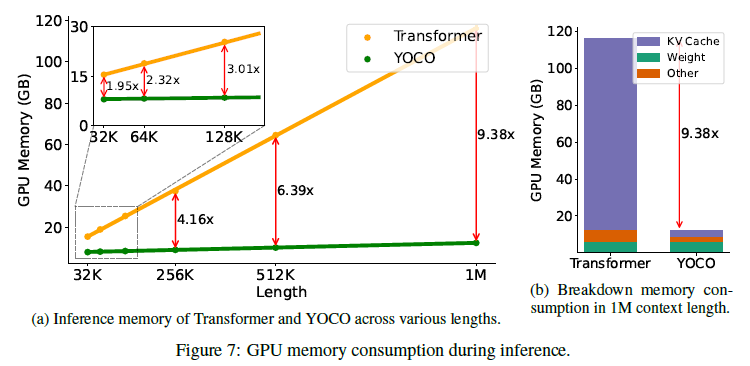- (a) 다양한 길이에 따른 트랜스포머와 YOCO의 추론 메모리.