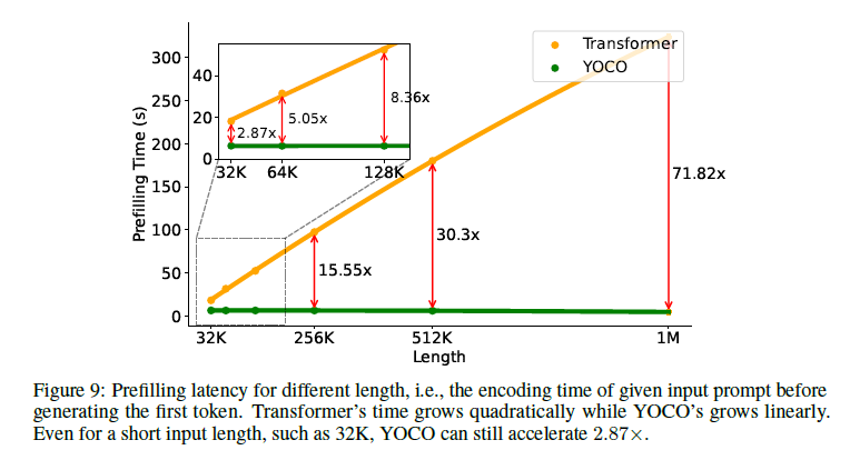 그림 9: 다양한 길이에 따른 사전 채우기 지연 시간, 즉 첫 번째 토큰 생성 전에 주어진 입력 프롬프트의 인코딩 시간. 트랜스포머의 시간은 이차적으로 증가하는 반면, YOCO는 선형적으로 증가합니다. 짧은 입력 길이(예: 32K)에서도 YOCO는 2.87배 더 빠릅니다.