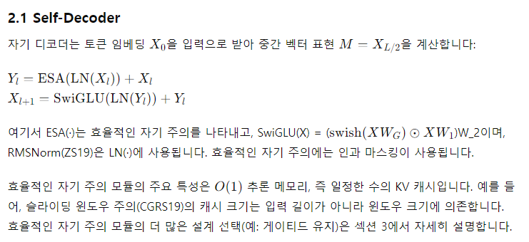 자기 디코더를 위해 다양한 효율적인 자기 주의 방법을 선택할 수 있습니다. 이 모듈이 일정한 추론 메모리만 필요하다면, 자기 디코더의 캐시 메모리 복잡성은 레이어 수에 의존합니다. 또한, 좋은 모듈 선택은 학습 및 배포 비용을 모두 개선합니다. 이 연구에서는 게이티드 유지(섹션 3.1) 또는 슬라이딩-윈도우 주의(섹션 3.2)를 사용합니다.